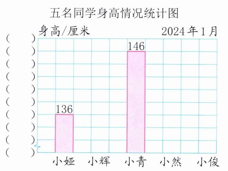 4. 小娅比小辉矮6厘米,小然比小辉高2厘米,小俊在这五名同学中,身高排第二。根据这些信息把统计图补充完整。(身高都是整厘米数)