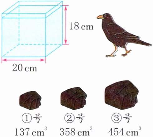 4. (南京秦淮区)同学们都知道“乌鸦喝水”的故事,一个正方体水槽里装了一些水(如图),乌鸦只能够到水槽最上沿,在水槽的旁边有大小不一的三块石头,你能选择其中的两块石头,帮助乌鸦喝到水吗? 请说说你的做法,并用计算加以说明。