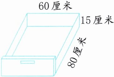 解析:制作抽屉的木板包括一块长60厘米、宽15厘米的长方形木板(后面),两块长80厘米、宽15厘米的长方形木板(左、右面),一块长80厘米、宽60厘米的长方形木板(底面),一块长60厘米、宽(15+5)厘米的长方形木板(拉手所在的面)。