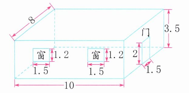 2. (生活应用)围棋社对活动室的四面墙壁(如下图,单位:米)进行粉刷(不包括上面),社长了解到某品牌涂料的信息如下表所示。这次粉刷至少要准备多少钱?