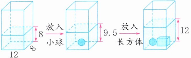 长方体 解析:由前两幅图可知,小球放入水中,水面升高9.5-8=1.5(cm)。由后两幅图可知,长方体放入水中,水面升高12-9.5=2.5(cm),放入长方体后水面升高的高度大于放入小球后水面升高的高度,所以长方体的体积大于小球的体积。