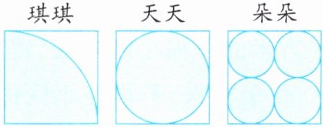 D 解析:先假设出正方形纸的边长,分别计算三人剪下图形(题图中涂色部分)的面积,再除以正方形纸的面积,算出谁对这张正方形纸的利用率最高。因为正方形纸的面积不变,则剪下图形面积最大的利用率最高。假设正方形纸的边长为4厘米,琪琪剪下图形的面积是π×4²×$\frac{1}{4}$=4π(平方厘米),天天剪下图形的面积是π×(4÷2)²=4π(平方厘米),朵朵剪下图形的面积是π×(4÷2÷2)²×4=4π(平方厘米)。所以三人对这张正方形纸的利用率是一样高的。