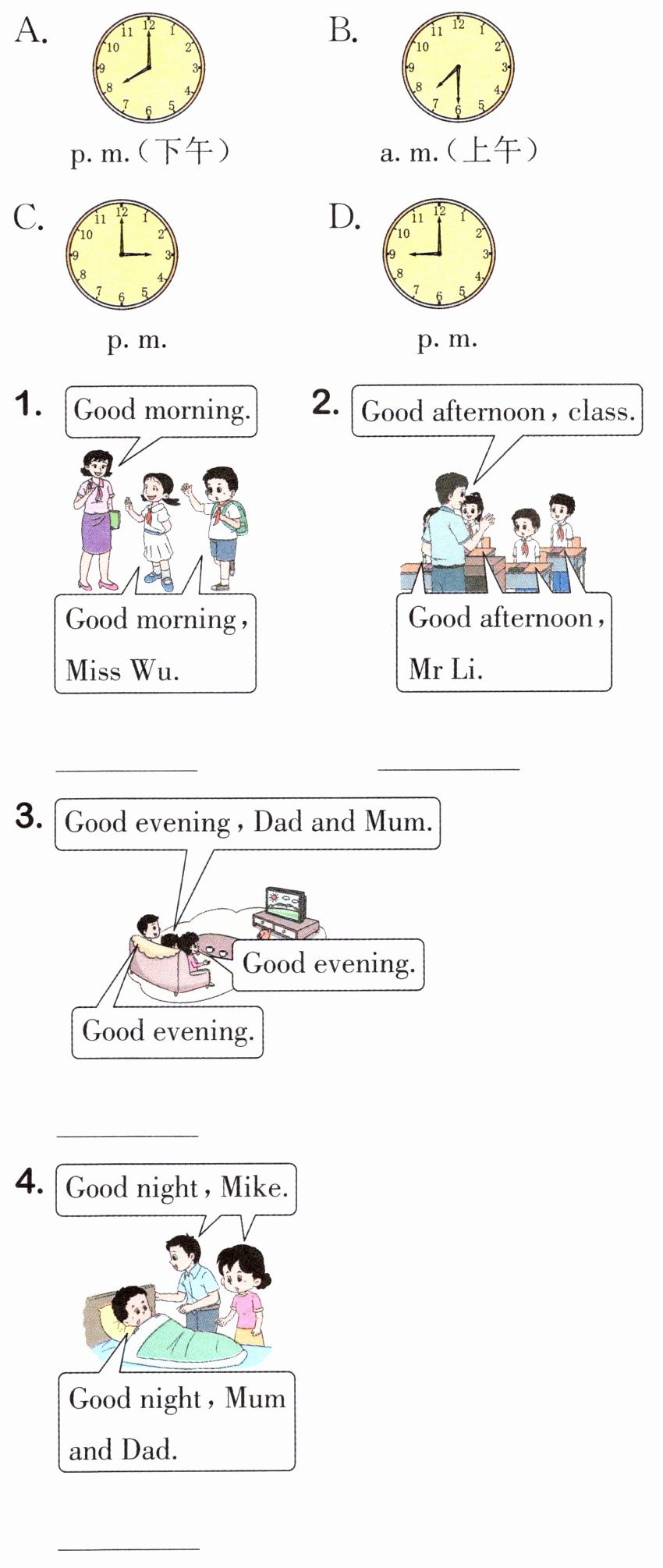 1. B 解析:由“Good morning.”可知,是上午时间。 2. C 解析:由“Good afternoon,class.”可知是下午上课时间。 3. A 4. D