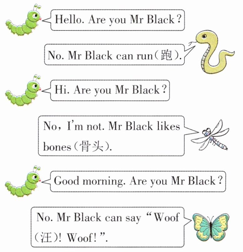 1. T 解析:根据毛毛虫询问“Are you Mr Black?”可知,毛毛在寻找 Mr Black。 2. T 3. F 4. T 5. T 解析:根据 Mr Black 喜欢骨头和会汪汪叫,可知 Mr Black 是一只狗。