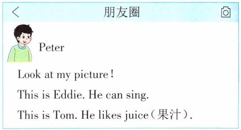 六、[新素材]回到家后,杨玲在看 Peter 的朋友圈。请阅读 Peter 的朋友圈,给朋友圈中的人物选择对应的人名。