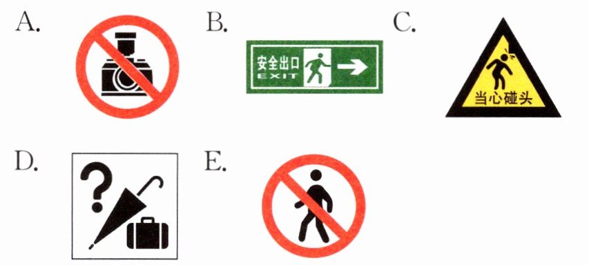 四、[新考法]生活中有很多标识,你知道它们的意思吗? 给下列句子选择相应的标识。(有一项多余)