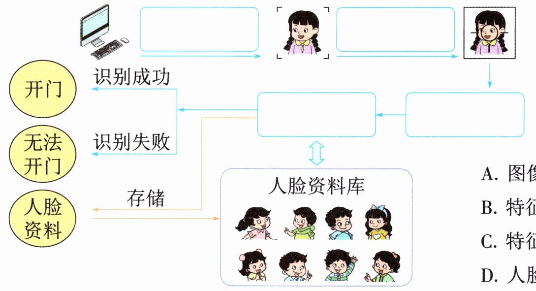 A D C B 解析:“刷脸进门”要先进行图像采集,再人脸定位,然后特征提取,最后特征比对,根据比对结果进行判定。