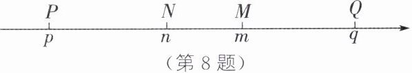 8. 若有理数m,n,p,q在数轴上的对应点M,N,P,Q的位置如图所示,且n与q互为相反数,则绝对值最大的数对应的点是 (