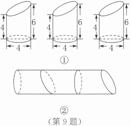 9. 如图①所示为三个直立于水平面上的形状完全相同的几何体(下底面为圆),将它们拼成如图②所示的新几何体,该新几何体的体积为______(结果保留π).