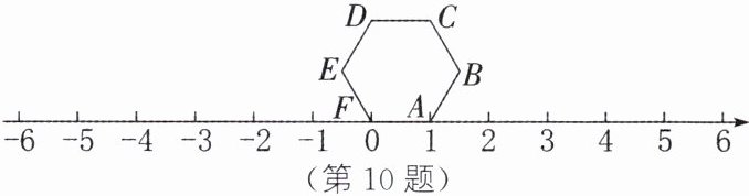 10. (2025·郑州金水期末)正六边形 ABCDEF 在数轴上的位置如图所示,点 A,F 表示的数分别为 1 和 0.若正六边形 ABCDEF 绕顶点按顺时针方向在数轴上连续翻转,翻转 1 次后,点 B 所表示的数为 2;翻转 2 次后,点 C 所表示的数为 3……按此规律继续翻转下去,求数轴上数 2025 所对应的顶点.