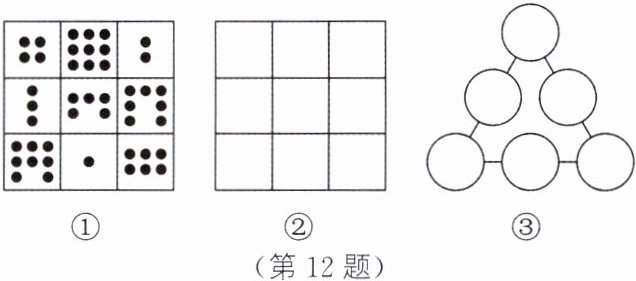12. 有人建议向火星发射如图①所示的图案,它叫作幻方,其中9个格中的点数分别是1,2,3,4,5,6,7,8,9.每一横行、每一竖列及两条斜对角线上的点数的和都相同.如果火星上有智慧生物存在,那么他们可以通过这种“数学语言”了解到地球上也有智慧生物(人).