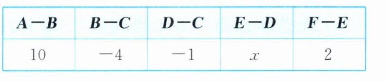 10. 已知数轴上有A,B,C,D,E,F六个点,点C在原点的位置,点B表示的数为-4.下表中,A-B,B-C,D-C,E-D,F-E的含义均为前一个点表示的数与后一个点表示的数的差,比如B-C= -4-0= -4.
