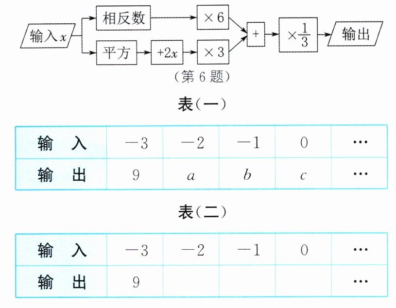 (1)当$x=-2$时,$a=\{[-(-2)]×6+[(-2)^{2}+2×(-2)]×3\}×\frac{1}{3}=[2×6+(4-4)×3]×\frac{1}{3}=(12+0)×\frac{1}{3}=4$;当$x=-1$时,$b=\{[-(-1)]×6+[(-1)^{2}+2×(-1)]×3\}×\frac{1}{3}=[1×6+(1-2)×3]×\frac{1}{3}=(6-3)×\frac{1}{3}=1$;当$x=0$时,$c=[0×6+(0^{2}+2×0)×3]×\frac{1}{3}=(0+0×3)×\frac{1}{3}=0×\frac{1}{3}=0$.填表(二)如下:输入-3-2-10…输出9410…(2)$x^{2}$.