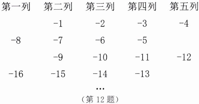 12. 我们在小学阶段学习了偶数0,2,4,6,8,…,以及奇数1,3,5,7,9,…,现在我们学过了负数,也知道了负偶数与负奇数,负偶数为-2,-4,-6,-8,…,负奇数为-1,-3,-5,-7,….如图,我们将这些负偶数与负奇数按一定的规律排列.观察这些数的规律,并求出-101在哪一列.