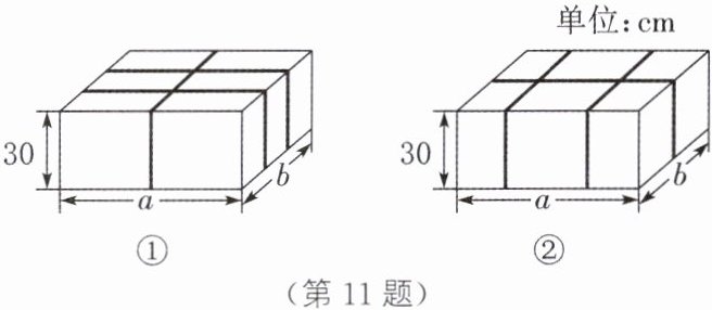11. 火车站、机场等场所都有为旅客提供打包服务的项目.现有一个长、宽、高分别为$a$cm,$b$cm,30 cm 的箱子(其中$a>b$),准备采用如图①②所示的两种打包方式,所用打包带的总长(不计接头处的长)分别记为$l_{1},l_{2}$.