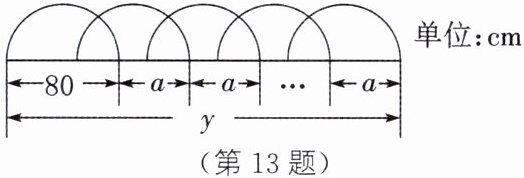13. 如图,某花园的护栏是用一些半圆形钢条围成的,半圆的直径为80cm,且每增加1根半圆形钢条,护栏的长度就增加acm(a>0).设半圆形钢条的总根数为x(x为正整数),护栏的总长度为ycm.