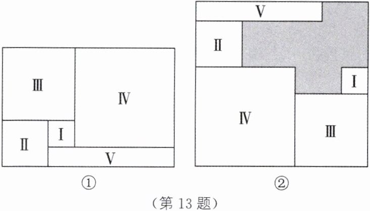 13. (2025·重庆江北期末)如图,将图①中周长为72的长方形纸片剪成Ⅰ,Ⅱ,Ⅲ,Ⅳ四个正方形和长方形Ⅴ,并将它们按图②的方式无重叠地放入另一个大长方形中,则涂色部分的周长为 (