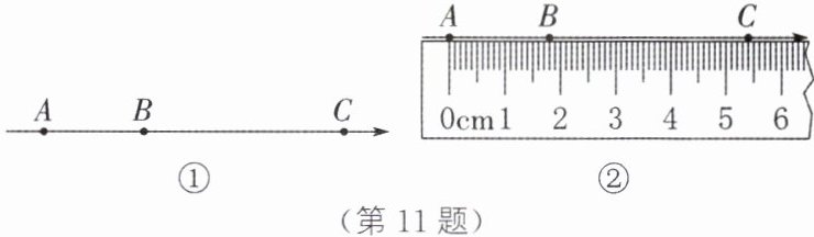 11. 如图①,A,B,C 是数轴上按从左到右的顺序排列的三个点,对应的数分别为-6,b,3.某同学将刻度尺按图②所示的方式放置,使刻度尺上的数字 0 对应数轴上的点 A,发现点 B 对应刻度 1.8 cm,点 C 对应刻度 5.4 cm.