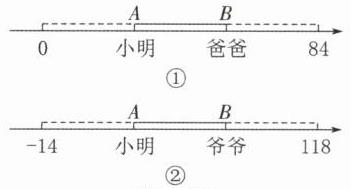 解析:借助如图①所示的数轴(1个单位长度表示1岁),把小明和爸爸的年龄差看作木棒AB的长. 易得爸爸比小明大$84÷ 3=28$(岁),所以爸爸的年龄是$84-28=56$(岁).