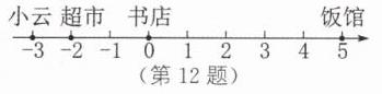 12. 超市、书店、饭馆依次坐落于一条东西走向的大街上,超市在书店的西边 20 m 处,饭馆在书店的东边 50 m 处,小云从书店出来后沿街先向东走了 50 m,然后向东走了-80 m,此时小云在超市的什么方位? 请以书店为原点,向东为正方向画出数轴(数轴上 1 个单位长度表示 10 m),并在数轴上标出超市、饭馆的位置及小云最后的位置.