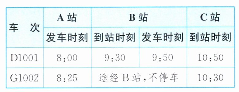 (2)①5:6. 解析:根据题意,得D1001次列车从A站到C站共需90+60=150(分钟),G1002次列车从A站到C站共需35+60+30=125(分钟).所以150v1=125v2.所以v1:v2=5:6.