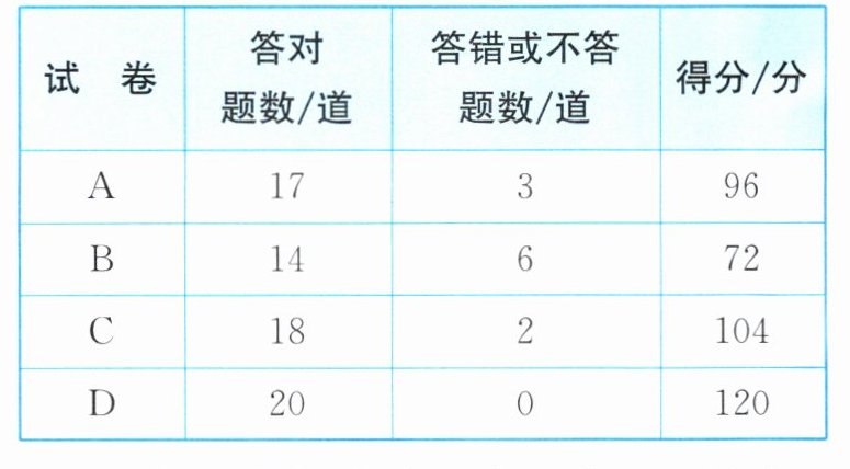 10. (2025·襄阳谷城期末)某班进行了一次趣味知识竞赛,共有20道选择题,每道题答对得相同分数,答错或不答扣相同分数.现从中抽出了四份试卷进行分析,结果如下表: