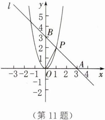 11. 如图,直线$l过A(3,0)和B(0,3)$两点,它与二次函数$y= ax^2的图象在第一象限内交于点P$. 若$\triangle AOP的面积为3$,求该二次函数的解析式.