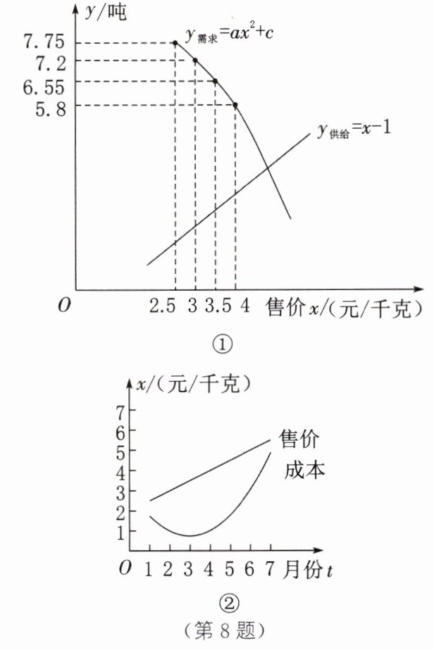 (1)把(3,7.2),(4,5.8)代入y需求=ax²+c,得{9a+c=7.2,16a+c=5.8,解得{a=-15,c=9.