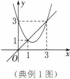 典例1 函数$y= x^2 + bx + c与y= x$的图象如图所示,现有下列结论:①$b^2 - 4c > 1$;②$b + c + 1 = 1$;③$3b + c + 6 = 1$;④当$1 < x < 3$时,$x^2 + (b - 1)x + c < 1$。
