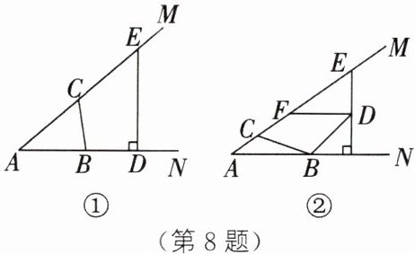 8. (2024·北京)已知∠MAN= α(0°<α<45°),点B,C分别在射线AN,AM上,将线段BC绕点B按顺时针方向旋转180°-2α得到线段BD,过点D作AN的垂线,交射线AM于点E.