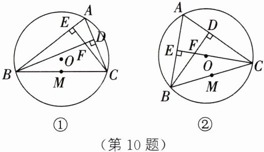 10. 如图①,BD,CE 是$\triangle ABC$的高,BD,CE 相交于点 F,M 是 BC 的中点,$\odot O是\triangle ABC$的外接圆.