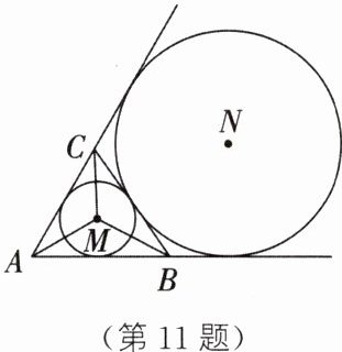 如图,在△ABC 中,设 BC= a,AC= b,AB= c,$p= \frac{a+b+c}{2}$,⊙M 是△ABC 的内切圆,⊙N 分别与 AC 的延长线、AB 的延长线以及线段 BC 均只有一个公共点,⊙M 的半径为 m,⊙N 的半径为 n.