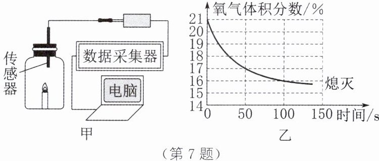 7. 新考法·数字化实验 如图甲所示,将燃着的蜡烛放入密闭的容器中,同时用传感器测得密闭容器中氧气体积分数的变化如图乙所示。下列说法中,正确的是( )