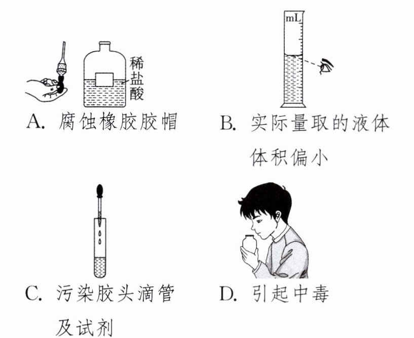 B 解析:使用胶头滴管的过程中不可平放或倒置,否则会腐蚀橡胶胶帽,A不符合题意。量取液体时,视线应与量筒内液体的凹液面最低处保持水平,图中仰视刻度线,会造成读数偏小,实际量取的液体体积偏大,B符合题意。使用胶头滴管滴加少量液体时,应注意胶头滴管不能伸入试管内或接触试管内壁,应垂直悬空在试管口上方滴加液体,防止污染胶头滴管及试剂,图中的滴管伸入试管内,可能会污染胶头滴管及试剂,C不符合题意。凑到试剂瓶口闻气味,可能会引起中毒,D不符合题意。
