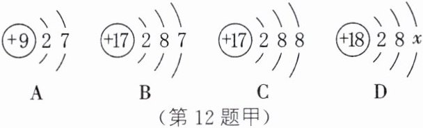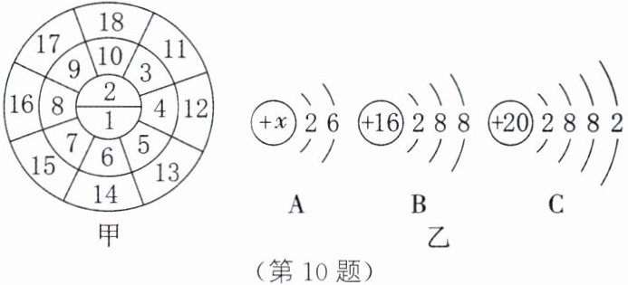 10. 新考法·创新模型 元素周期表前 18 号元素按原子序数递增的顺序排成如图甲所示的图形,图中数字为元素的原子序数。如图乙所示为 3 种微观粒子的结构示意图。