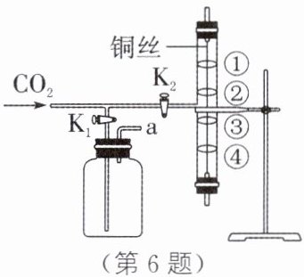 6.(2024·内江期末)如图所示为探究二氧化碳性质实验的装置,气体从最左端玻璃管口进入,其中右边铜丝上的①④是用紫色石蕊溶液浸湿的棉球,②③是浸过紫色石蕊溶液后干燥的棉球。下列说法中,错误的是 ( )