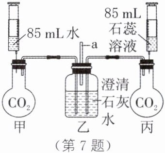 7. 跨学科·物理 为验证$CO_2$的性质,学习小组的同学设计如图所示的装置进行实验。将两支注射器中的液体依次平缓注入充满二氧化碳的烧瓶(容积为250 mL)中,再同时振荡两个烧瓶。下列说法中,不正确的是 ( )