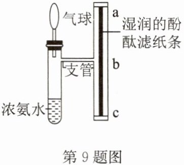 9. B (2024 春·海港区校级期末)某化学兴趣小组为探究分子的运动情况,在 T 形管的粗玻璃管里,固定一根湿润的酚酞滤纸条,完成下列实验。实验一:将浓氨水加入左侧试管中,3 分钟后观察到 ba 段滤纸条先变红。实验二:换一根湿润的酚酞滤纸条,微微加热试管,发现 ba 段滤纸条更快变红。下列说法错误的是 (
