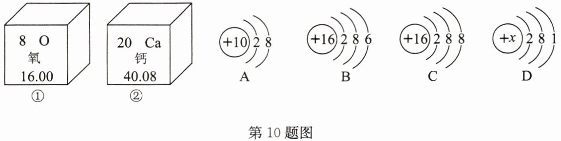 10. A 如图①、②分别是氧元素、钙元素在元素周期表中的信息,A、B、C、D 是四种粒子的结构示意图。