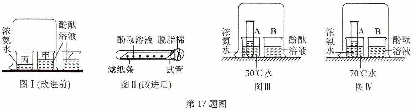 17.【进行实验】溶液变红色 是不断运动的【实验改进】滤纸条上的酚酞溶液由右至左依次变红色 分子是不断运动的【分析讨论】①在试管下面放一张白纸②节约试剂③滤纸条上滴加的是浓氨水,脱脂棉上滴加的是酚酞溶液【拓展延伸】①图Ⅳ中的酚酞溶液先变红色 ②温度越高,分子运动得越快