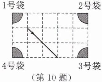 10. 如图所示为一个经过改造的台球桌面的示意图,图中四个角上的涂色部分分别表示四个球袋.如果一个球按图中所示的方向被击出(球可以经过多次反弹),那么该球最后落入的球袋是______号袋(填球袋的编号).