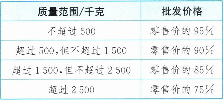 表格说明:批发价格分段计算,若某人批发苹果 2100 千克,则总费用为 $[8×95\%×500 + 8×90\%×1000 + 8×85\%×(2100 - 1500)]$ 元.