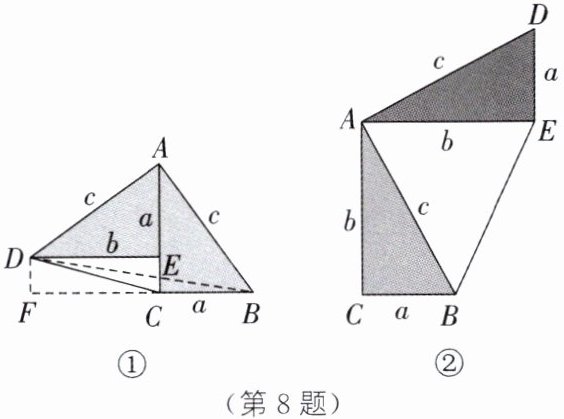 8. 当两个全等的直角三角形按如图①或图②所示的方式摆放时,都可以用“面积法”来证明勾股定理,下面是小聪利用图①证明勾股定理的过程: