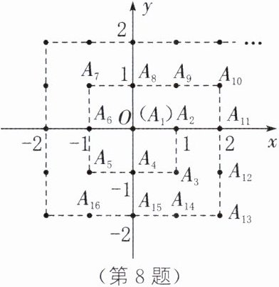 8. 数学家高斯推动了数学学科的发展,被数学界誉为“数学王子”,据传,他在计算 $ 1 + 2 + 3 + 4 + … + 100 $ 时,用到了一种方法,将首尾两个数相加,进而得到 $ 1 + 2 + 3 + 4 + … + 100 = \frac{100 × (1 + 100)}{2} $. 人们借助这样的方法,得到 $ 1 + 2 + 3 + 4 + … + n = \frac{n(1 + n)}{2} $ ($ n $ 是正整数). 如图,在平面直角坐标系中有一系列格点 $ A_i(x_i,y_i) $,其中 $ i = 1 $、$ 2 $、$ 3 $、…$ $、$ n $、…$ $,且 $ x_i $、$ y_i $ 是整数. 记 $ a_n = x_n + y_n $,如 $ A_1(0,0) $,即 $ a_1 = 0 $, $ A_2(1,0) $,即 $ a_2 = 1 $, $ A_3(1,-1) $,即 $ a_3 = 0 $, …$ $,以此类推,则下列结论正确的是 (