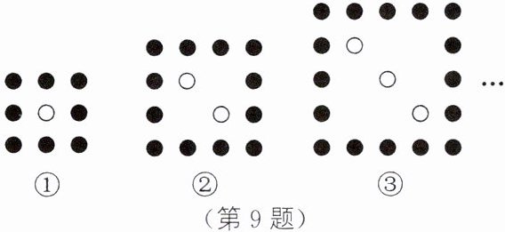 9. 下图中的棋局都是由同样大小的黑棋、白棋按一定规律组成的,其中图①中白棋有1枚,黑棋有8枚;图②中白棋有2枚,黑棋有12枚;图③中白棋有3枚,黑棋有16枚,…,按此规律排列下去,若某个图中白棋有x枚,黑棋有y枚,则y与x之间的关系可以表示为____.
