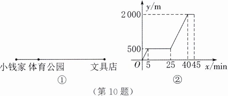 10. 如图①,小钱家、体育公园、文具店依次在同一条马路上.某日,小钱步行从家出发,先到体育公园锻炼20min,再到文具店,用了5min购买文具,然后按原路返回家中.已知小钱往返途中的步行速度不变,设小钱从家出发xmin时,距家ym,y关于x的部分图象如图②所示.