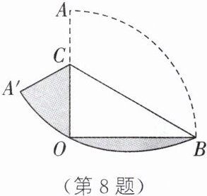 8. 如图,扇形 AOB 中,∠AOB= 90°,OB= $\sqrt{3}$,C 为 AO 上一点,将扇形 AOB 沿着 BC 折叠,A'B 恰好经过点 O,则涂色部分的面积为 (