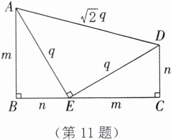 11. 如图,将两个全等的Rt△ABE和Rt△ECD拼在一起,连接AD,点B、E、C在同一条直线上,$AE \perp ED$.已知直角三角形的直角边长分别为m、n,斜边长为q,分别以m、$\sqrt{2}q$、n为二次项系数、一次项系数和常数项构造的关于x的一元二次方程$mx^2 + \sqrt{2}qx + n = 0$,称为勾股方程.