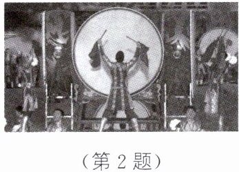 2. (2024·自贡)2024年央视主办的春节联欢晚会上,演员们用中国大鼓(如图)、排鼓等乐器呈现开场表演《鼓舞龙腾》,铿锵有力的鼓声使现场听众感受到了新年即将到来的喜悦气氛。下列说法中,正确的是 ( )