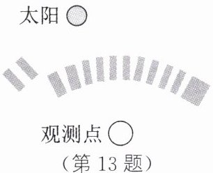13. 新情境·古代科技 山西陶寺古观象台由13根直立的夯土柱组成,呈半圆形,如图所示为其结构示意图,据考古学家研究推断,古人在观测点通过土柱间的狭缝观测日出方位,以此确定季节和节气。其利用的光学原理是______。
